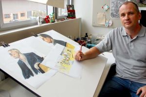 Explica que dibuixa i pinta els elements de forma separada i, posteriorment, els passa pel photoshop, escannejant i unint totes les peces digitalment.