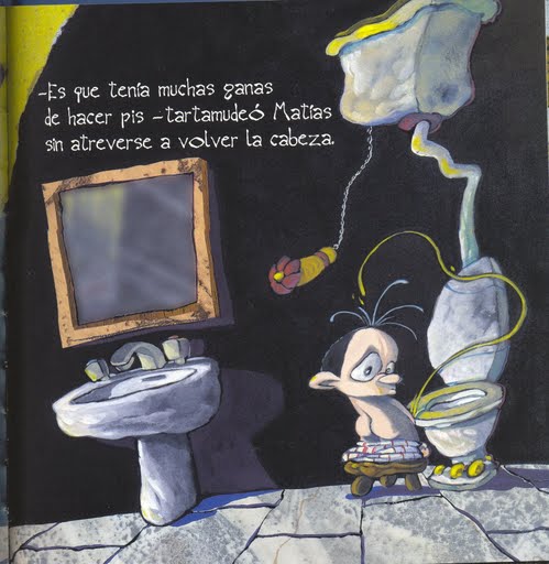 En Martinet no pot aguantar el pipí i va corrents al lavabo. La imatge és fantàstica: el nen pujat dalt d’un tamboret, fent pipí, tremolant per si l’enganxen, quan de sobte algú (una ombra deformada que sembla un rei) li pregunta, amb veu fonda: «I tu, què hi fas aquí?». Aggg, pillat! En Martinet corre a amagar-se sota els llençols i l’endemà quan es desperta comença a buscar el tren.