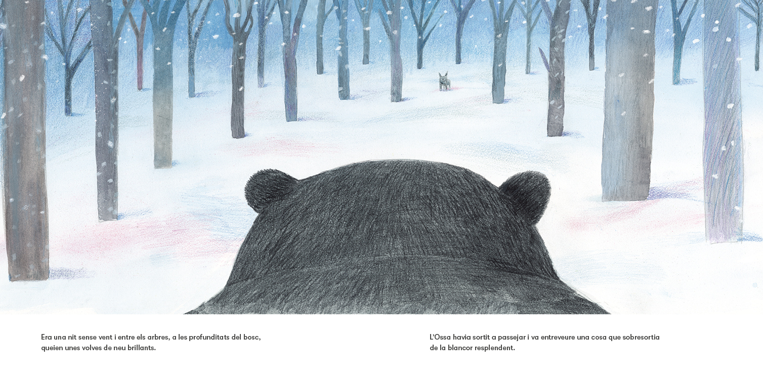 Era una nit sense vent i entre els arbres, a les profunditats del bosc, queien unes volves de neu brillants. L’Ossa havia sortit a passejar i va entreveure una cosa que sobresortia de la blancor resplendent.