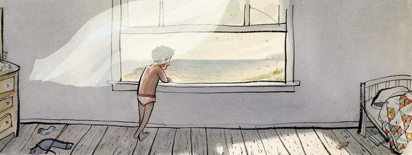A la portada veiem un nen assegut dalt d’una teulada contemplant un mar brillant i immens que s’escampa davant seu. Les pàgines següents són un anar i venir dels espais tancats (casa, mina) als espais oberts (carrers, parcs i, sobretot, el mar).