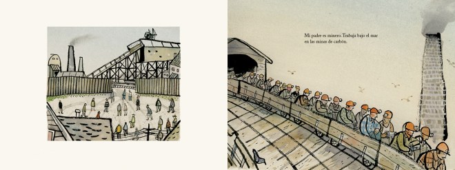 La part gràfica és molt bonica, amb unes tintes potents que remarquen molt bé el contrast entre els dos mons (el poble i la mina, l’exterior i sota el mar) perquè mentre anem veient què fa el noi durant el dia (jugar amb els amics, visitar la tomba de l’avi) ens va recordant que els seu pare està treballant a la mina que hi ha sota el mar i llavors, en passar pàgina veiem una negror que només ens deixa intuir, a la part de sota del full, les siluetes dels miners picant carbó. Impressionant.