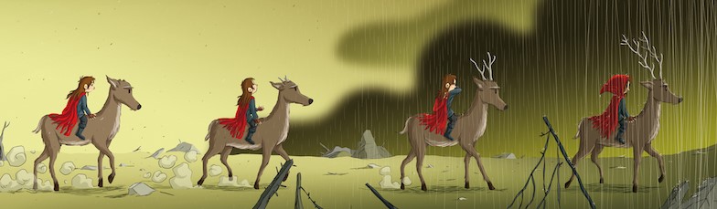 La protagonista és una nena abillada amb una capa amb caputxa vermella que va muntada a lloms d’un cérvol. Caminen per un lloc erm, trist, sec i solitari fins que veuen, allà lluny, una central nuclear abandonada. I entren.