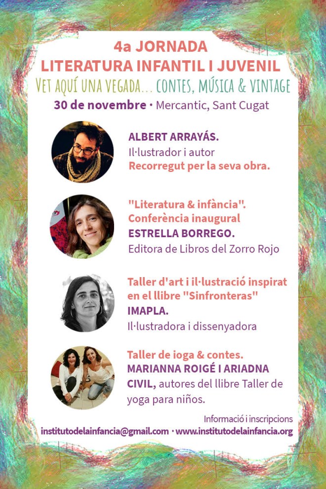«Deixa’ns endinsar-te en un món meravellós ple d’encant i habitat per llibres i música en un ambient vintage que et seduirà… Caminarem per racons màgics de la mà d’Estrella Borrego, editora i especialista en LIJ, que ens descobrirà tot allò que amaguen un munt de contes que podreu compartir amb els infants… Ens acompanyarà en el nostre passeig Albert Arrayás, gran il·lustrador i autor d’àlbums que ens desvetllarà els misteris de les seves imatges… I experimentarem noves sensacions amb tallers d’art i ioga, que ens permetran viure i sentir la màgia dels contes des d’una proposta més dinàmica i vivencial. »