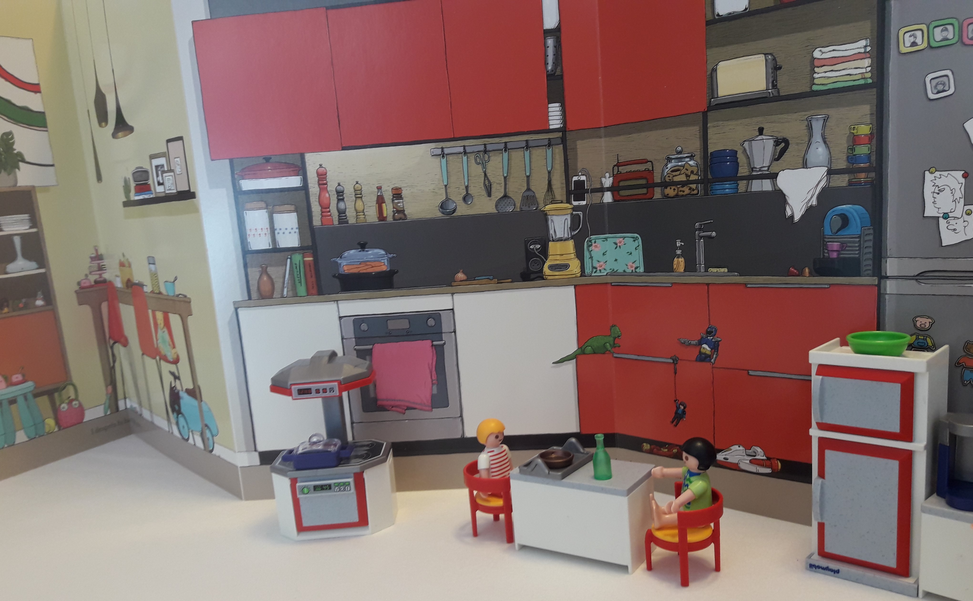 A la part del darrera veiem la casa per dins. Hi ha mobles, objectes, joguines, però no apareixen humans i aquest detall ens obre la possibilitat a múltiples interpretacions: Qui hi deu viure? Què fan? Com són? Què els agrada?, etc.