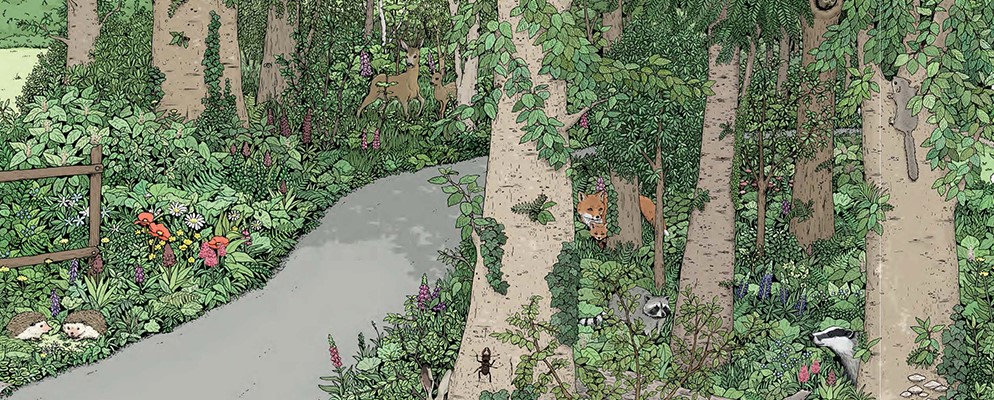 El viatge per arribar a la bonica casa de fusta que hi ha al bosc ens convida a baixar del tren, pujar a l’autobús i observar el poble, el riu i el bosc, en un viatge que és una oportunitat per descobrir animals, plantes i persones escampades al llarg dels quatre metres que ocupa el llibre desplegat.