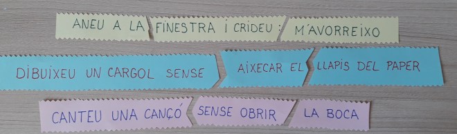 El «Trencaclosques de frases» en que els infants agrupats formant trios consensuen una frase que és una ordre a realitzar pel grup que la composi. L’escriuen i es retalla en tres parts, a manera de peces de trencaclosques. Després es mesclen amb les altres frases i es llença a l’aire com pluja de papers. Cadascú n’agafa una i ha de trobar els altres dos companys que comparteixen missatge. El llegeixen i fan el que diu la frase («Aneu a la finestra i crideu: M’avorreixo!», per exemple).