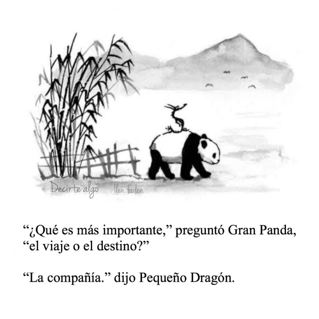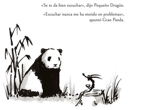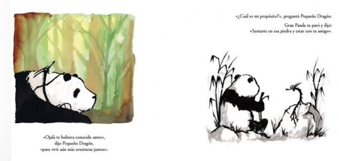 «Gran Panda y Pequeño Dragón» no és ben bé un relat amb inici, nus i desenllaç. Ens explica que el Panda i el Drac inicien un viatge (en primavera que és quan tot comença) per les estacions de l’any i durant el viatge es perden. És una metàfora de la nostra vida perquè sovint estem perduts (alguns més que d’altres). En aquesta pèrdua troben llocs preciosos que d’altra manera no haguéssin trobat. Recordeu el poema de Robert Lee Frost?…Doncs aquesta és la idea.