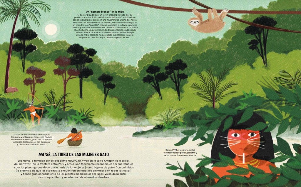 «Tribus. Viatge per alguns dels pobles més sorprenents de la Terra» és un llibre de coneixements fascinant. A cada doble plana ens presenta un d’aquests pobles i amb unes breus indicacions ja sabem on viuen, de què viuen, si són nòmades, com es relacionen, com es diverteixen, els seus rituals, etc. Una meravella. Fixeu-vos per exemple en la tribu Matsé, la de les dones gat: