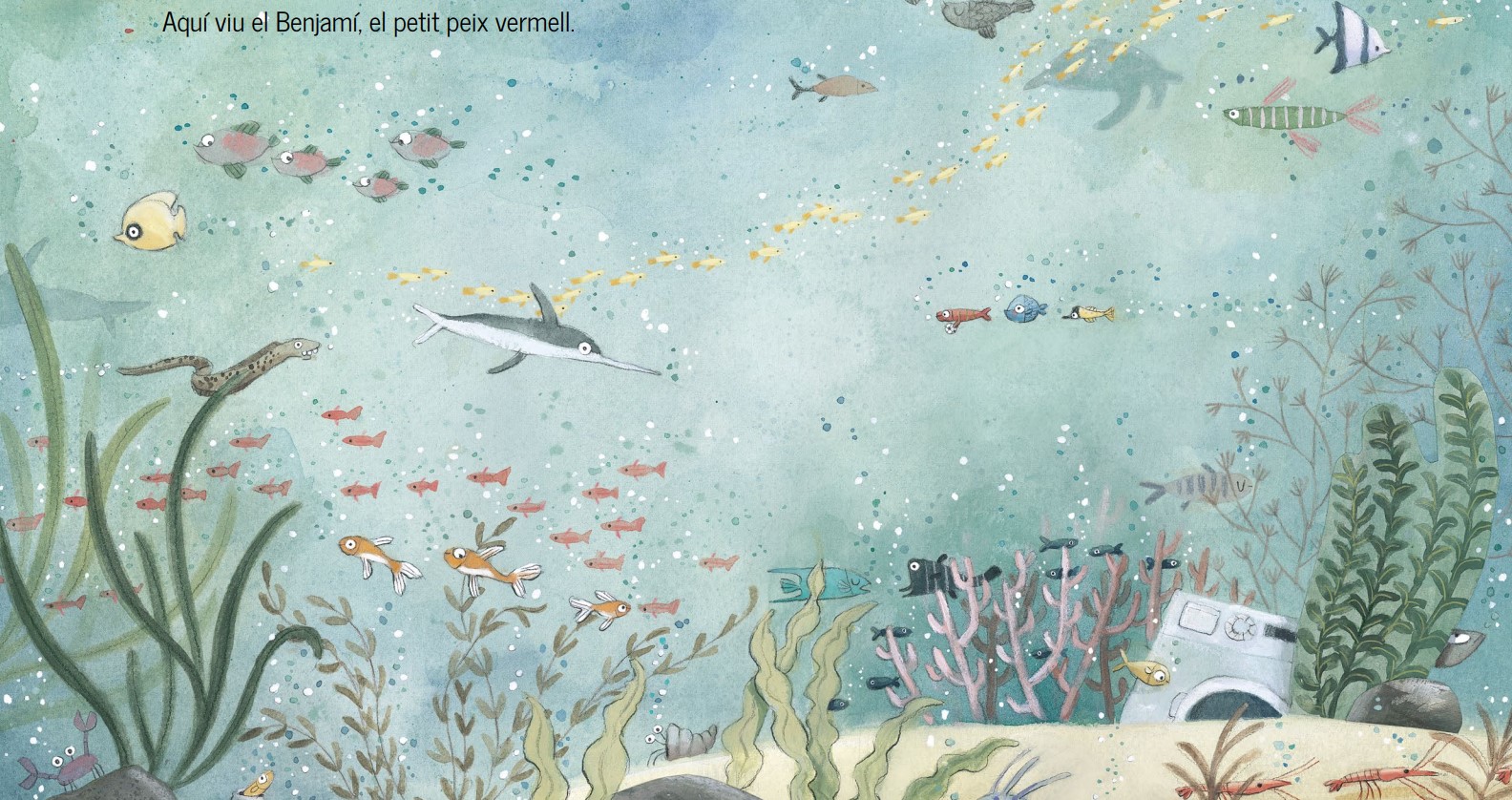 A la trobada, la Rocio ens va poder explicar el tractament i la importància que dóna a les mirades del peixos (i a les no mirades, perquè, en bona part del relat, la colla va amb els ulls tancats), al color canviant segons la situació, al nom del peix protagonista: Benjamí. Es va comentar que Benjamí vol dir el més petit i té un cert paral·lelisme amb els protagonistes dels contes populars on el més petit sol ser l’heroi.