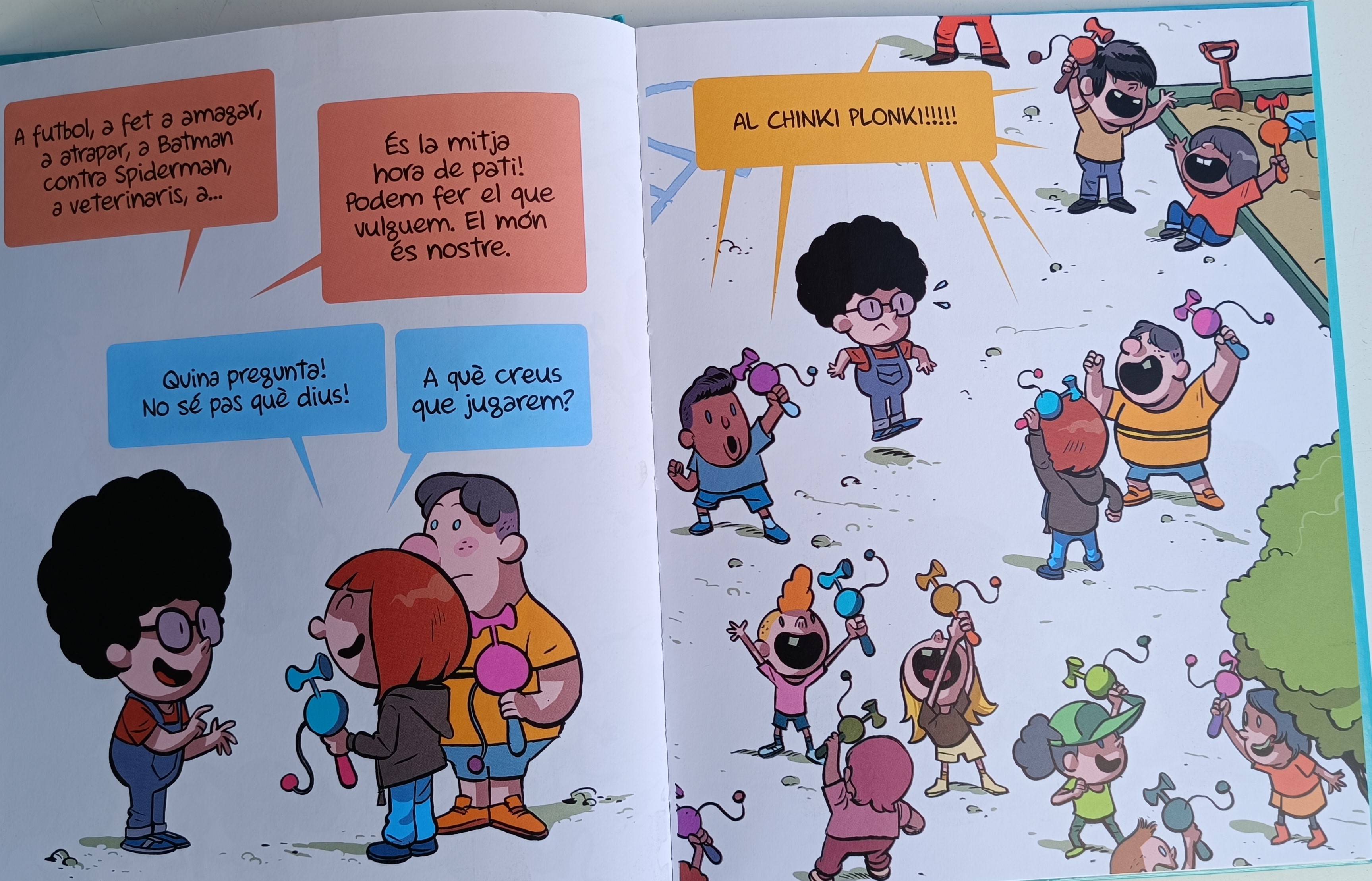 Als patis de les escoles és una imatge recurrent i cíclica. Hi ha èpoques de jugar a la baldufa, a cromos, a la corda, etc. Sempre són petits artugis que hi caben a les butxaques, lluny de la mirada de la mestra. De fet, els Chinki Plonkis són uns estris estranys que tenen als infants força enganxats.