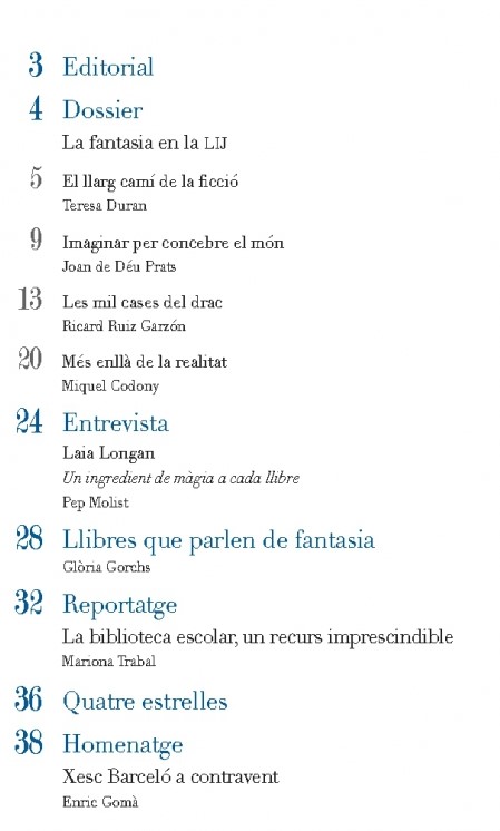 A la revista també hi trobareu un dossier dedicat a “La fantasia en la LIJ” amb escrits de la Teresa Duran, en Joan de Déu Prats, en Ricard Ruiz Garzón i en Miquel Codony, persones totes elles sàvies i enteses en literatura.