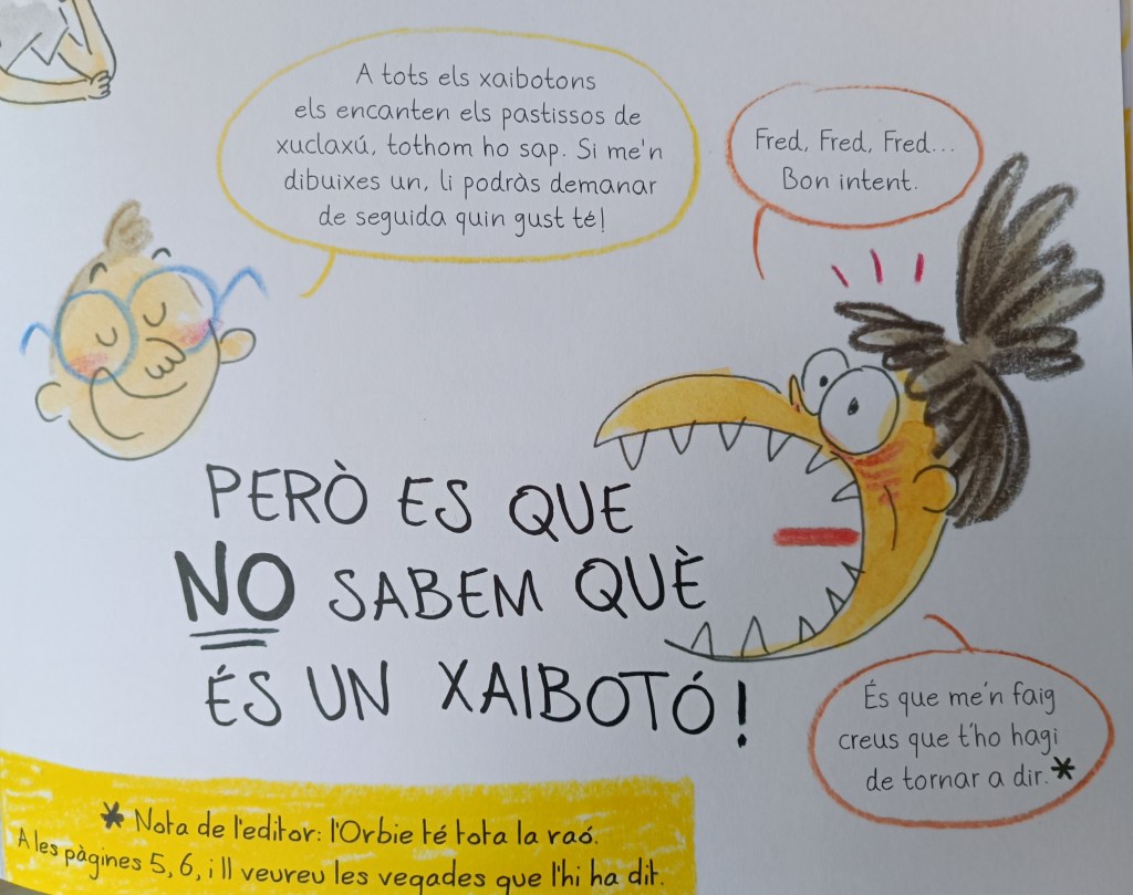 En Fred fa setmanes que intenta, sense èxit, dibuixar un “xaibotó” però no se’n surt. La solució, segons ell, és demanar ajuda a la seva amiga Orbie (ha vist que és la il·lustradora que apareix a la coberta).