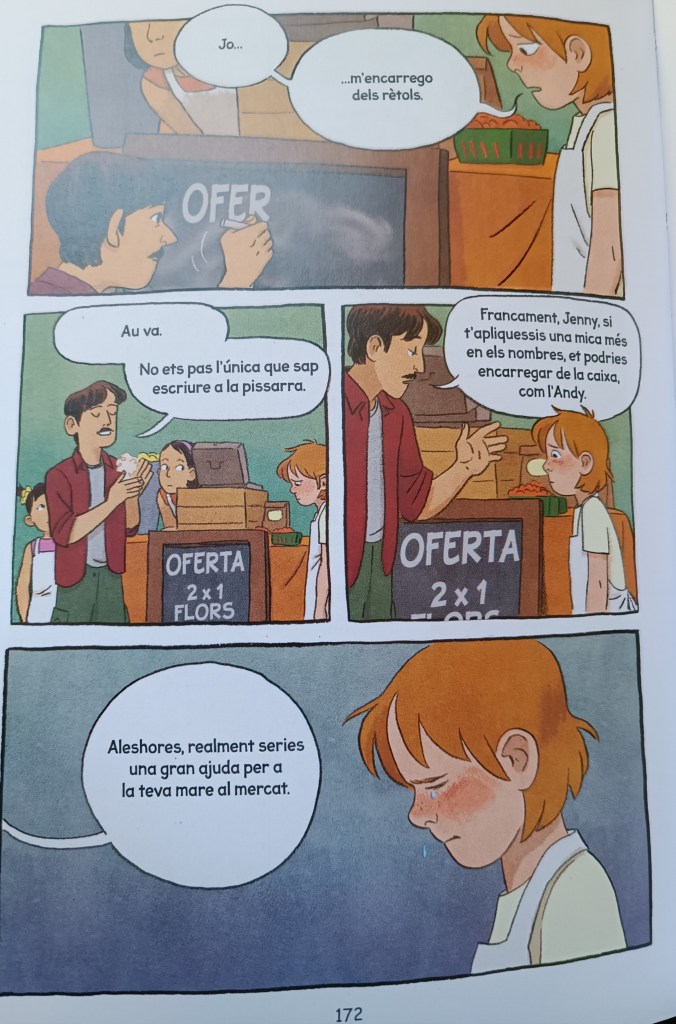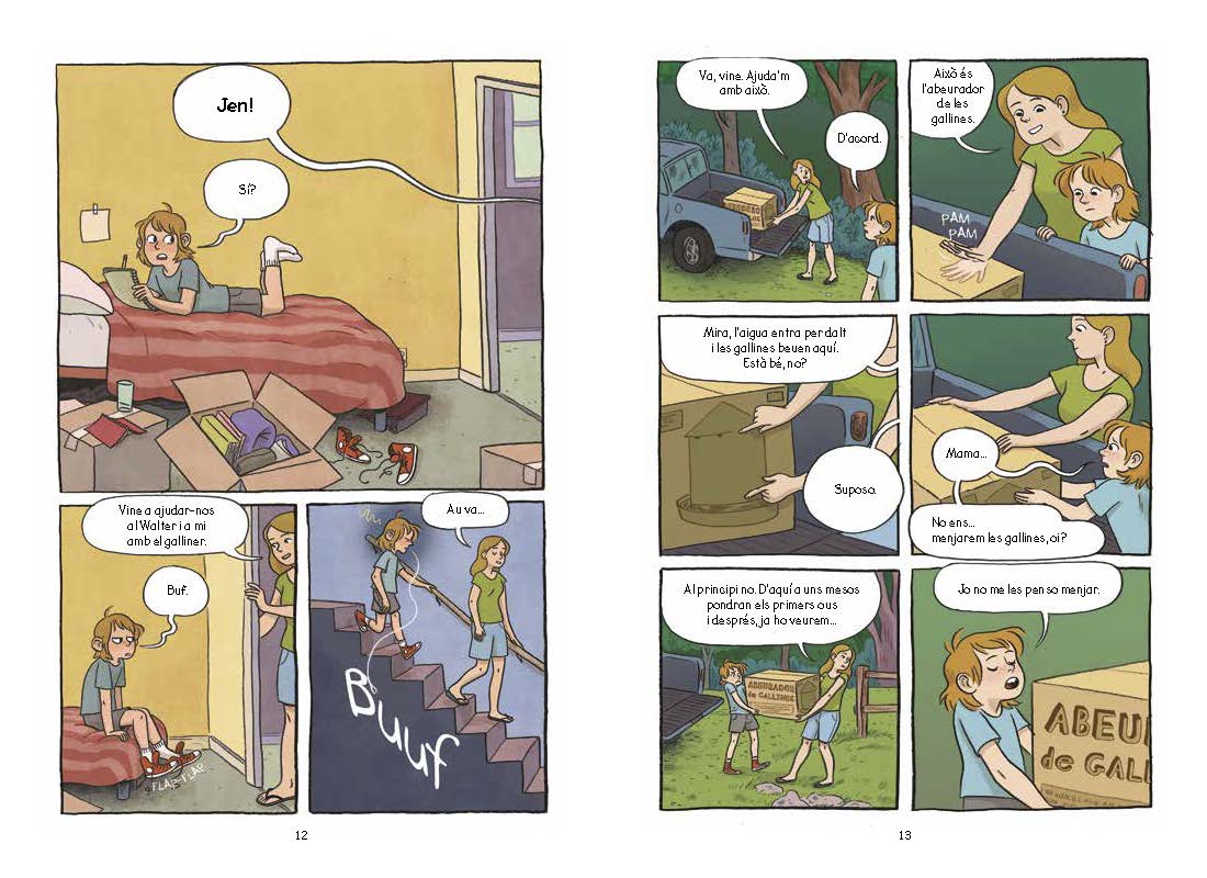 La línia gràfica és clara, entenedora, senzilla, amb imatges a tota pàgina o a dues pàgines, detalls acurats, S’hi assembla molt a la de la Raina Telgemeier, de qui hem comentat en aquests mateix blog, una de els seves obres, Germanes. Recordeu: (https://jaumecentelles.cat/2023/05/17/germanes-una-aventura-grafica-veridica/)