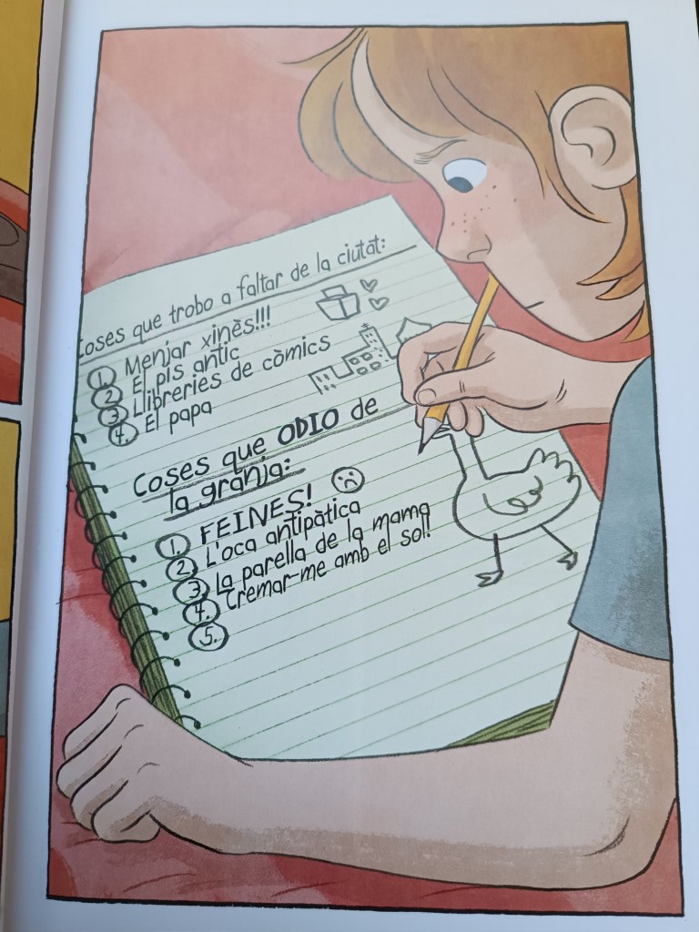 La narració ens explica com la Jen, després de la separació dels seus pares, ha de deixar la ciutat, els amics, els companys d’escola i marxar a viure amb la seva mare a un lloc nou. Aquest lloc és una granja i allà haurà de fer feines com tenir cura d’un grapat de pollets i acompanyar la mare al mercat setmanal on patirà amb els problemes que té per calcular el canvi de les vendes i altres feines que li treuen el temps que vol dedicar a la seva veritable passió que és dibuixar.