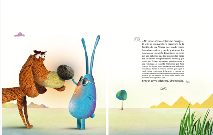 El primer de la sèrie és “De falsos perros y verdaderos leones” i ens conta la peripècia d’un gos que arriba al lloc on el cérvol i el conill estan tranquil·lament menjant una poma i albirant la posta de sol. Amablement li ofereixen una poma i el gos diu que no, que ell no menja fruita, només carn, perquè és un lleó.