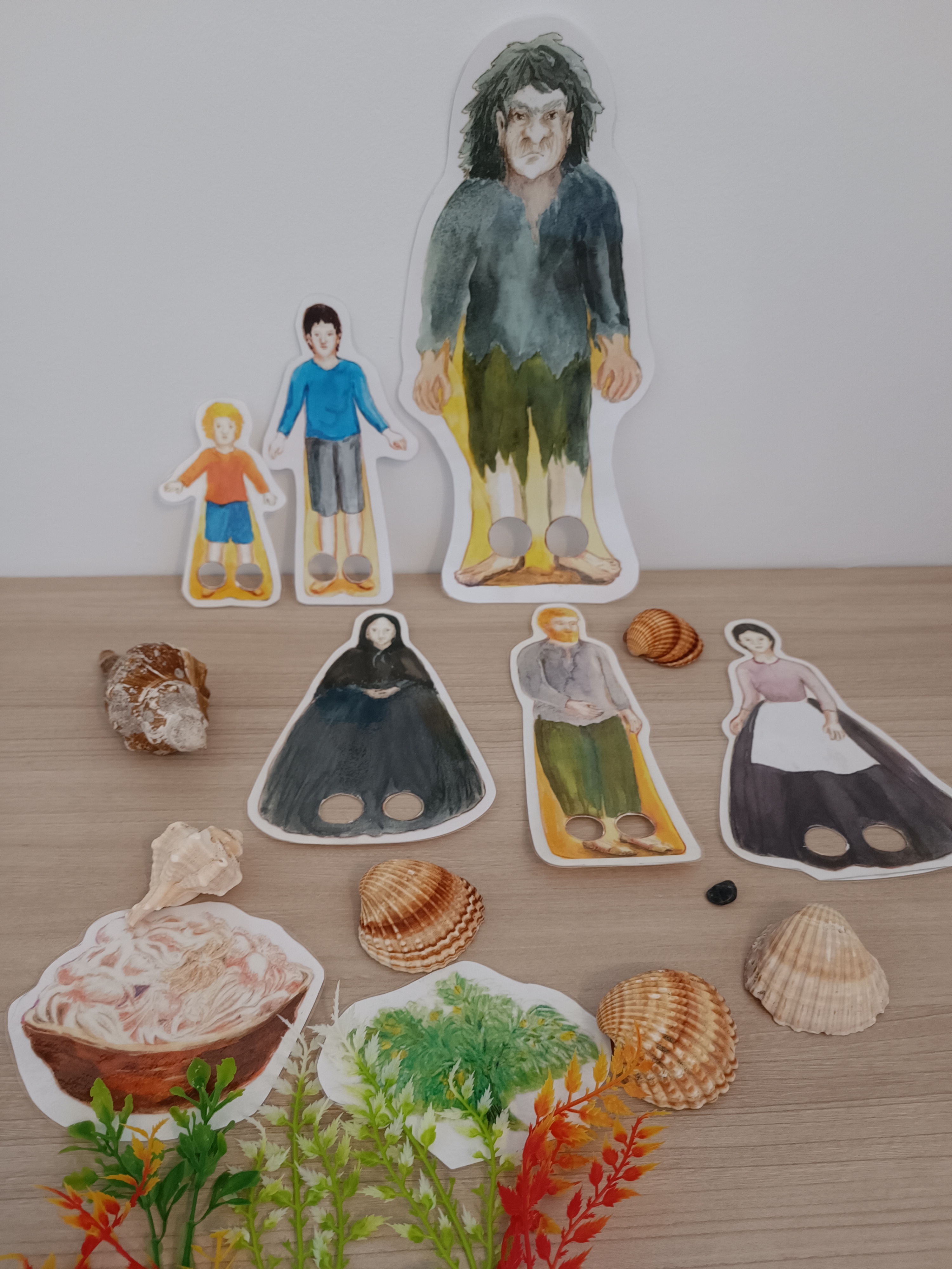 El material que conservo per explicar la rondalla consta d’un llibre amb activitats i entreteniments sobre el tema, dos escenaris en ziga-zaga, amb decorats dels llocs on es desenvolupa la història (l’illa des Vedrà, la costa d’e l’illa d’Eivissa, la casa dels protagonistes, el fons matí) i sis personatges amb dos forats a la part de sota, per ficar-hi els dits i així es converteixen en titelletes que es van movent. També l’acompanyo de tres objectes que apareixen: un llaüt, el fonoll marí i pops.