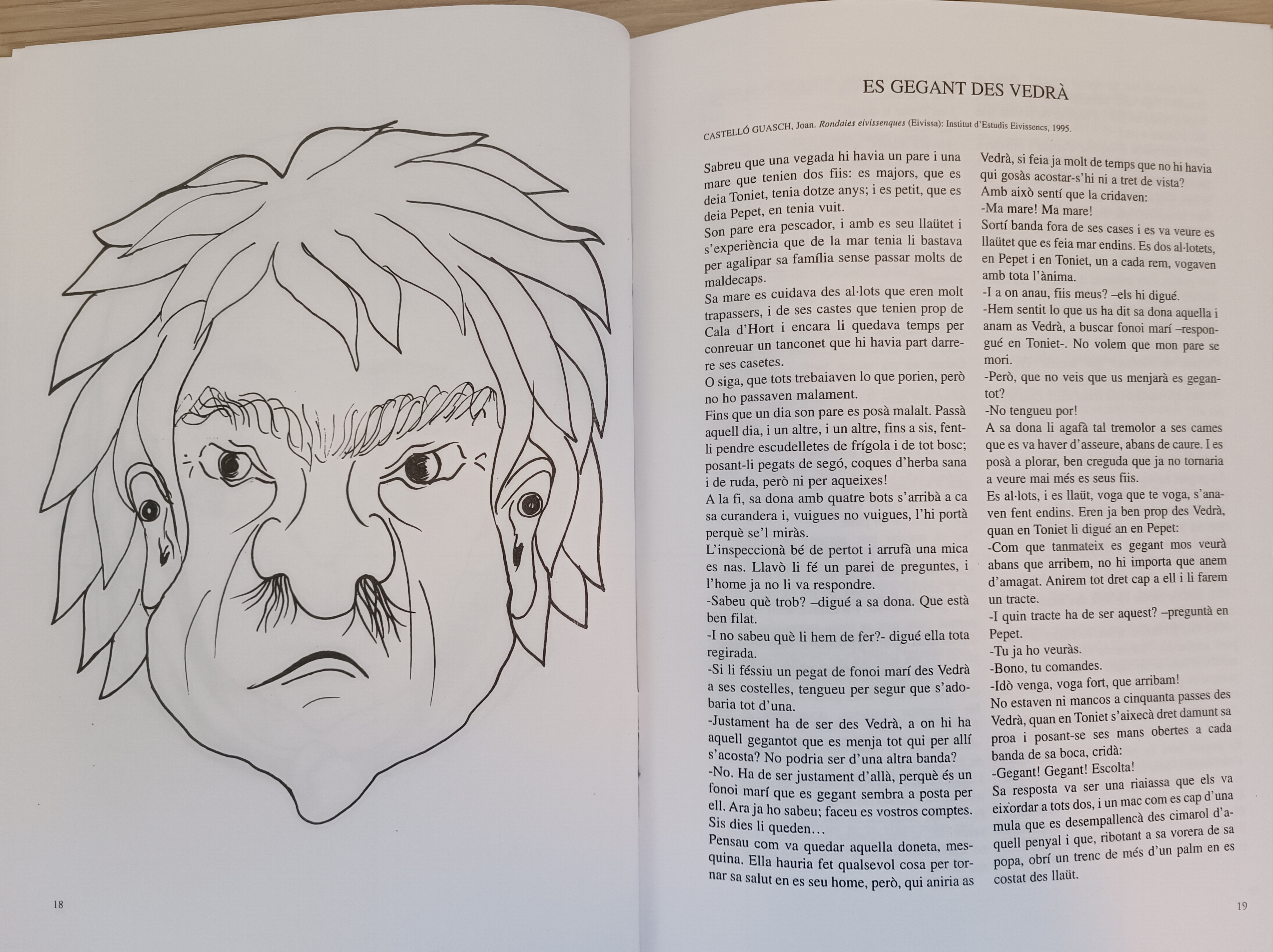 Una de les rondalles que es poden veure és la del gegant des Vedrà, un conte molt popular a Eivissa que he tingut ocasió d’explicar nombroses vegades gràcies a un material que va editar l’any 2005 el Consorci per al Foment de la Llengua catalana i la Projecció Exterior de la Cultura de les Illes Balears, amb el suport del Govern de les Illes Balears.