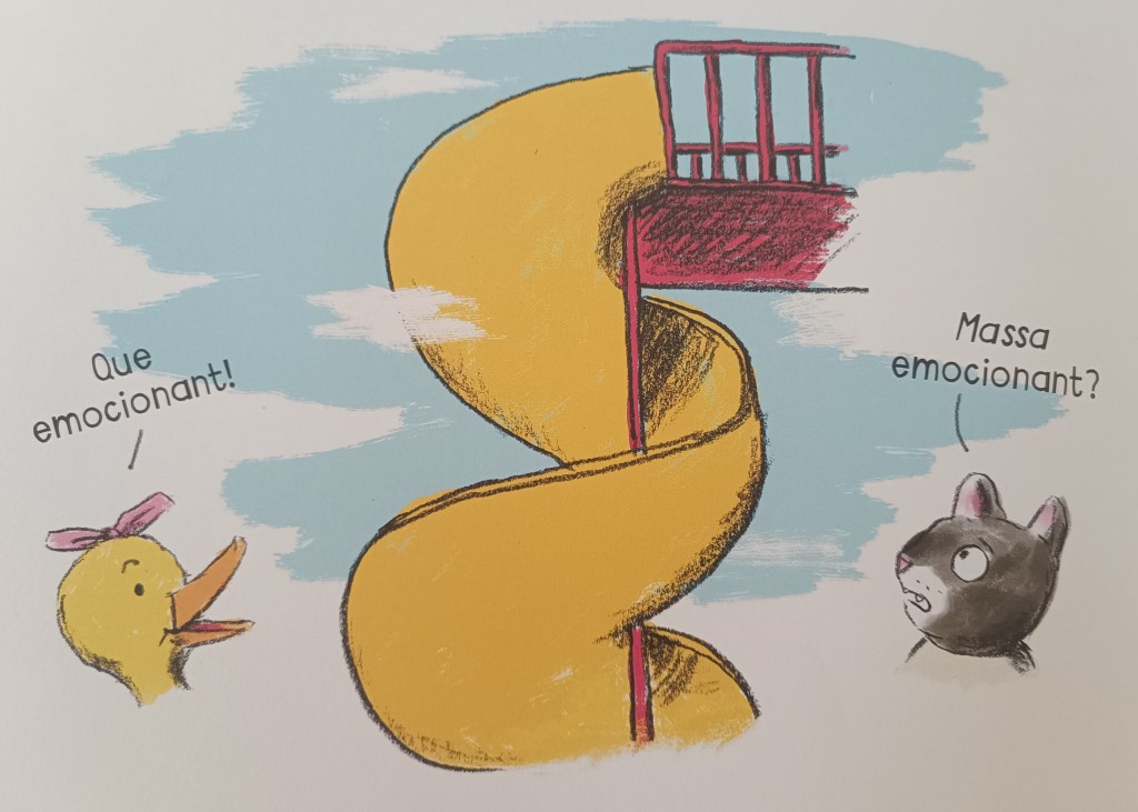 Quan, finalment l’ànega queda convençuda que, efectivament el tobogan és massa perillós, el gat se sent malament i té un sentiment de culpa per haver privat la seva amiga de baixar. Per solucionar-ho s’ofereix a baixar ell primer i resulta que s’ho passa molt bé, cosa que l’ànega ja sabia que podria passar perquè sap com gestionar els sentiments del seu amic.