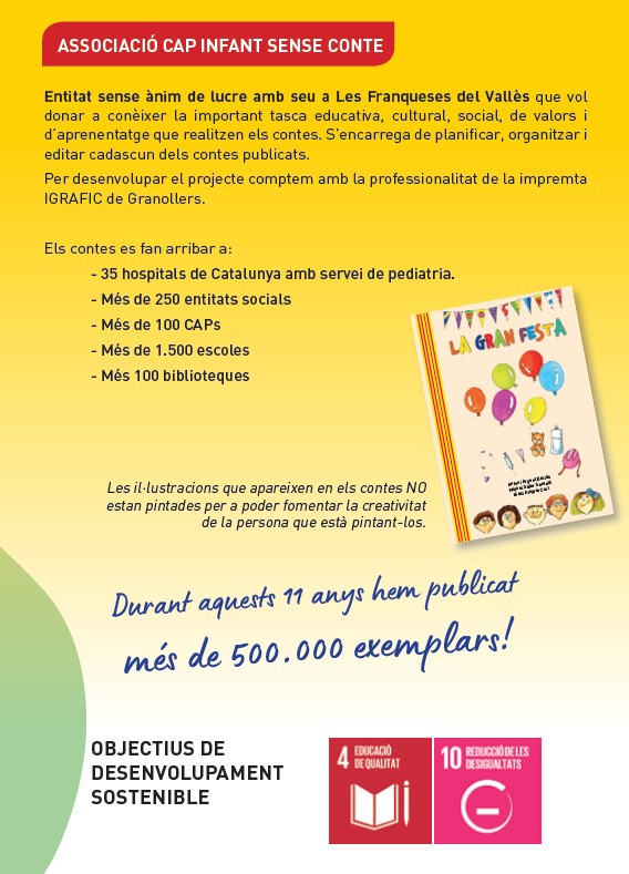 Enguany estan d’aniversari perquè cap infant sense conte celebren el 12è any d’aquesta iniciativa cultural, educativa i social que té com a objectius fomentar l’ús del català, l’hàbit lector i la creativitat dels infants. A més, pretén que, des de petits, sapiguem apreciar el valor i el gust per la lectura ja que són molts els beneficis de llegir: ajuda a enriquir el vocabulari, a millorar la comprensió lectora, la concentració, les habilitats lingüístiques, l’èxit escolar.