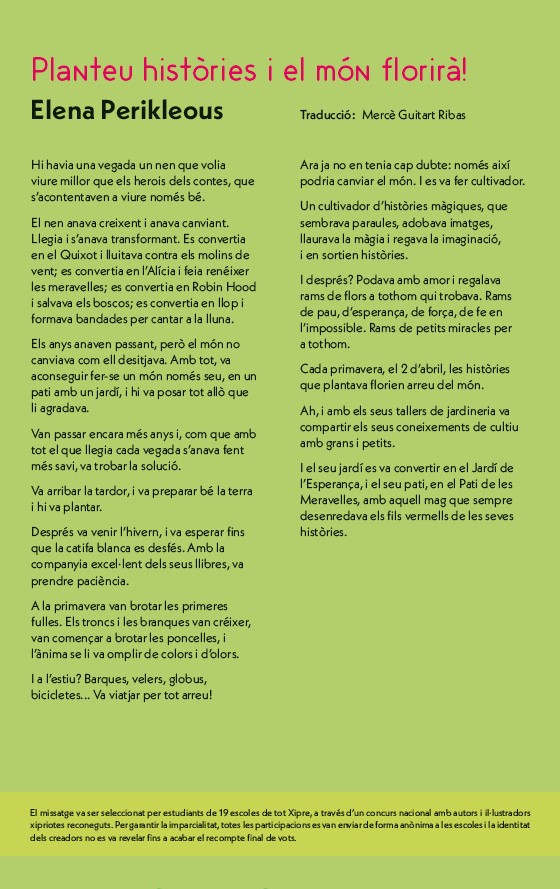 Enguany, la secció de Xipre d’IBBY és qui s’ha fet càrrec de l’efemèride, amb el lema “Planteu històries i el món florirà”, un missatge que posa en valor el poder transformador de les històries, els llibres i la lectura, i que alhora convida a adoptar formes de vida més respectuoses amb el medi ambient.