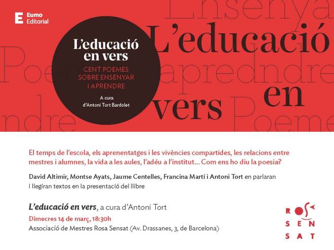 Un llibre que ens ofereix una mostra de com la poesia s’ha referit a l’escola i a l’educació. Molts poetes, catalans i estrangers, han dedicat versos al temps passat a les aules, als jocs amb els companys de classe, al record que ha deixat un bon mestre, a l’aprenentatge, al fet de créixer…