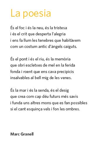 Enguany l’autor és en Marc Granell (València, 1953) un poeta i traductor consagrat i que ens ha regalat un poema titulat «La poesia»