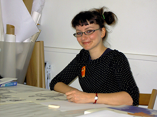 Normalment dibuixa amb acrílics i llapis, però si ens hi fixem podem veure que també empra els collages (de manera molt enginyosa, per cert). Al seu estudi té calaixos plens de petits quadrats de robes de cotó que ha anat comprant i guardant, així com tot tipus de segells de goma i de metall, flascons plens de grans de cafè i altres llavors, cotons, llumins usats, capses de galetes buides, etc.