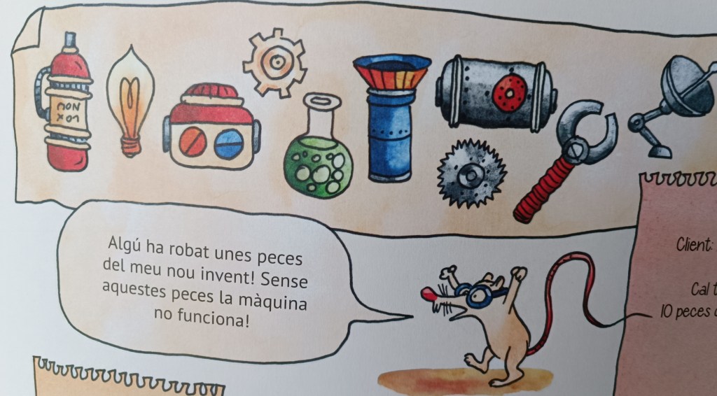 I aquí, entrem en joc nosaltres, els lectors, perquè a cada pàgina hem de fer una cerca per anar descobrint on s’amaguen els objectes desapareguts. Ve a ser com “buscant a Wally” però a l’engròs.