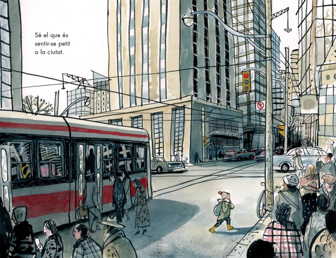 És la ciutat que ens atemoreix i ens fa petits. Mireu aquestes dues pàgines i noteu la sensació d’angoixa del nen que sembla buscar algú, des de la finestra del bus.