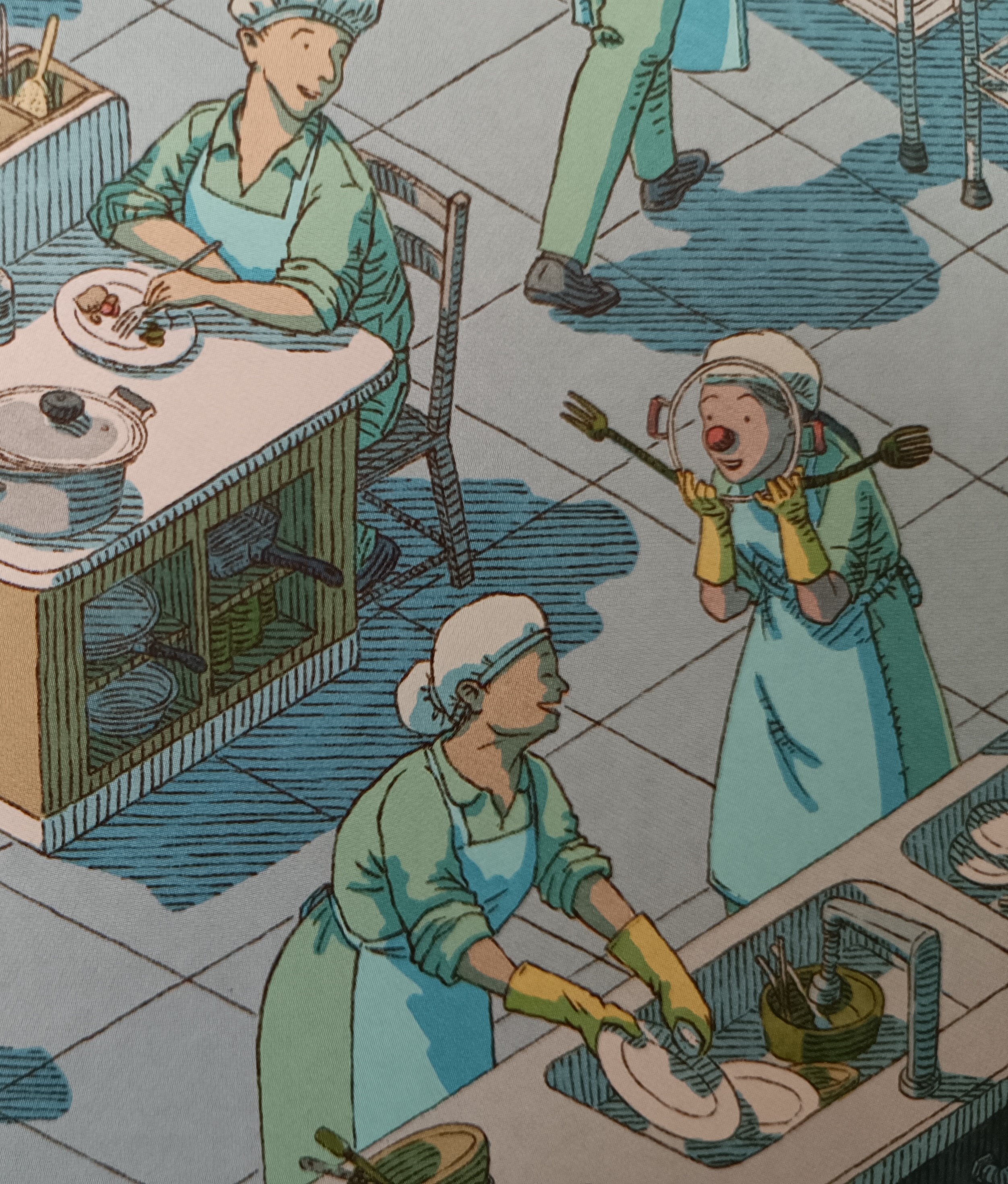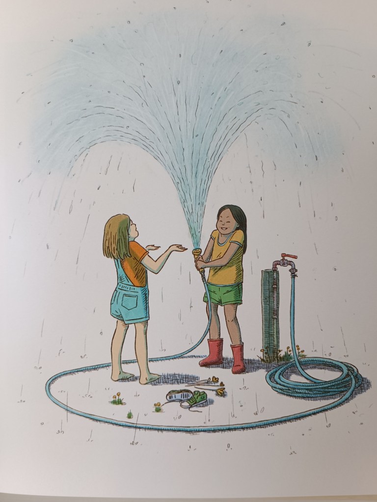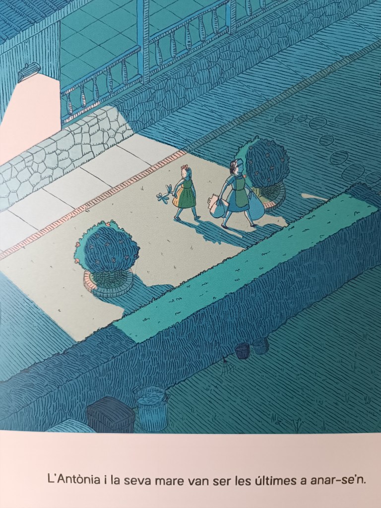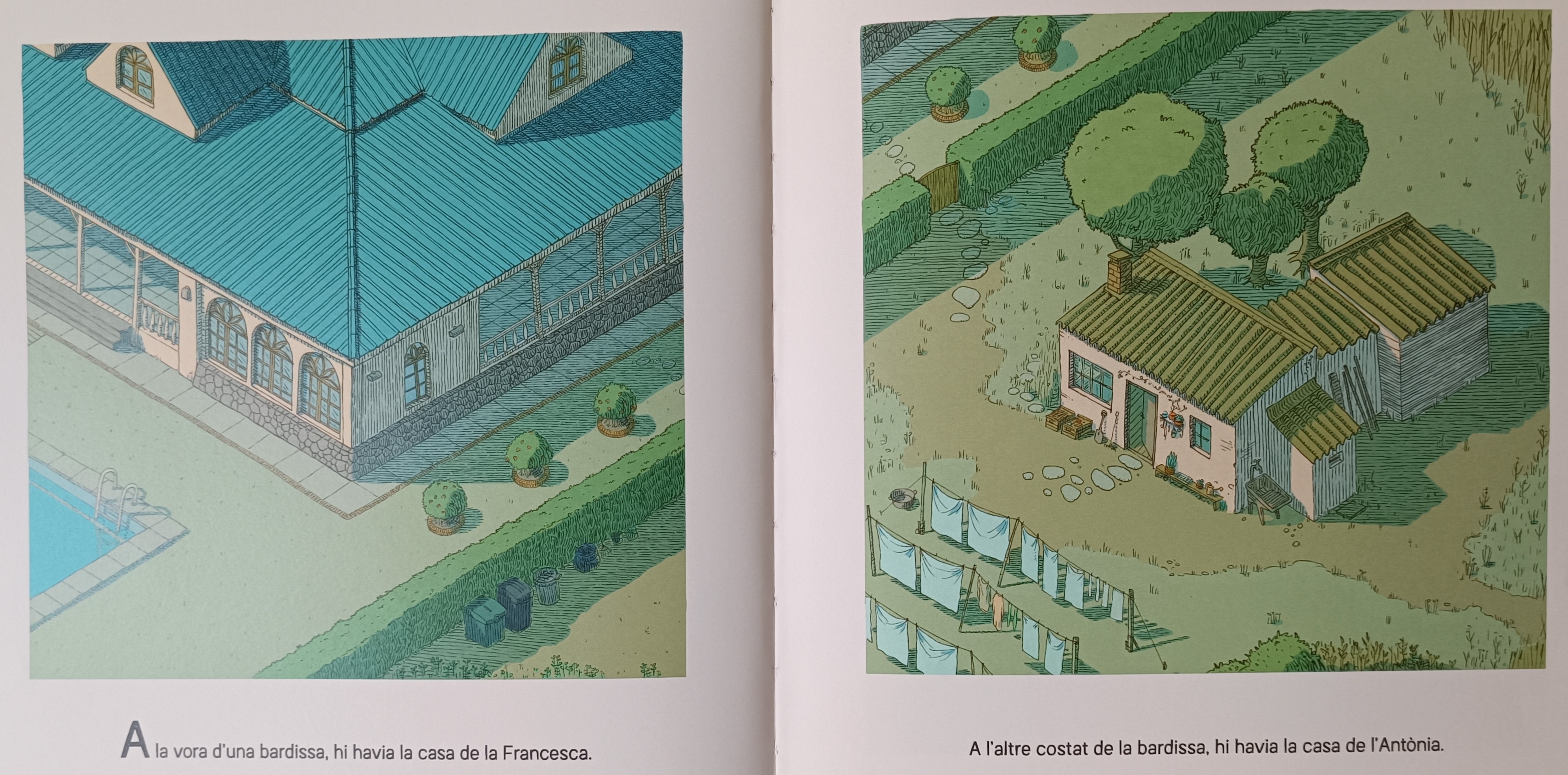 A cada doble pàgina, al full de l’esquerra llegim la pregunta i tot seguit la resposta. A la dreta, unes imatges precioses de la Rocío Bonilla que fa la interpretació de la pregunta.