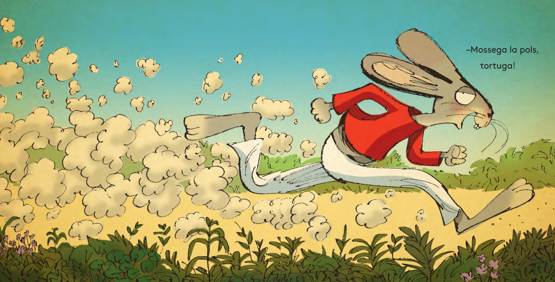 La faula de la llebre i la tortuga té diverses variants i, en aquest conte, l’autor juga de manera enginyosa amb l’inici d’Isop i ho acaba de manera similar a una de les diverses variants que proposava La Fontaine. Entremig, afegeix diverses possibilitats que ens fan riure molt veient l’enginy de la tortuga, i com la llebre a cada fracàs s’enfada més.