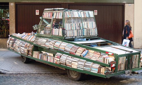 A la capçalera, hem posat una foto del vehicle que fa servir en Raul Lemesoff pels carrers de Buenos Aires. Ell l’anomena Arma de Instrucción Masiva (ADIM) i amb aquesta mena de tanc va pels carres i zones més desfavorides de la capital argentina regalant llibre a qui els vulgui acceptar.