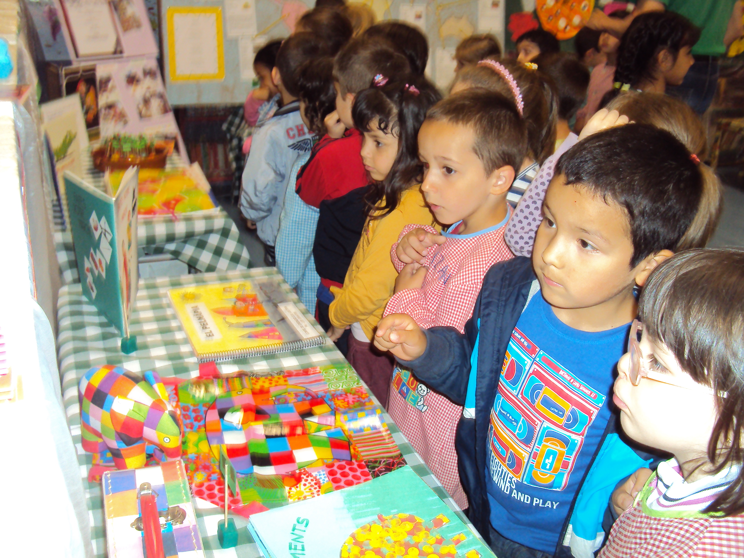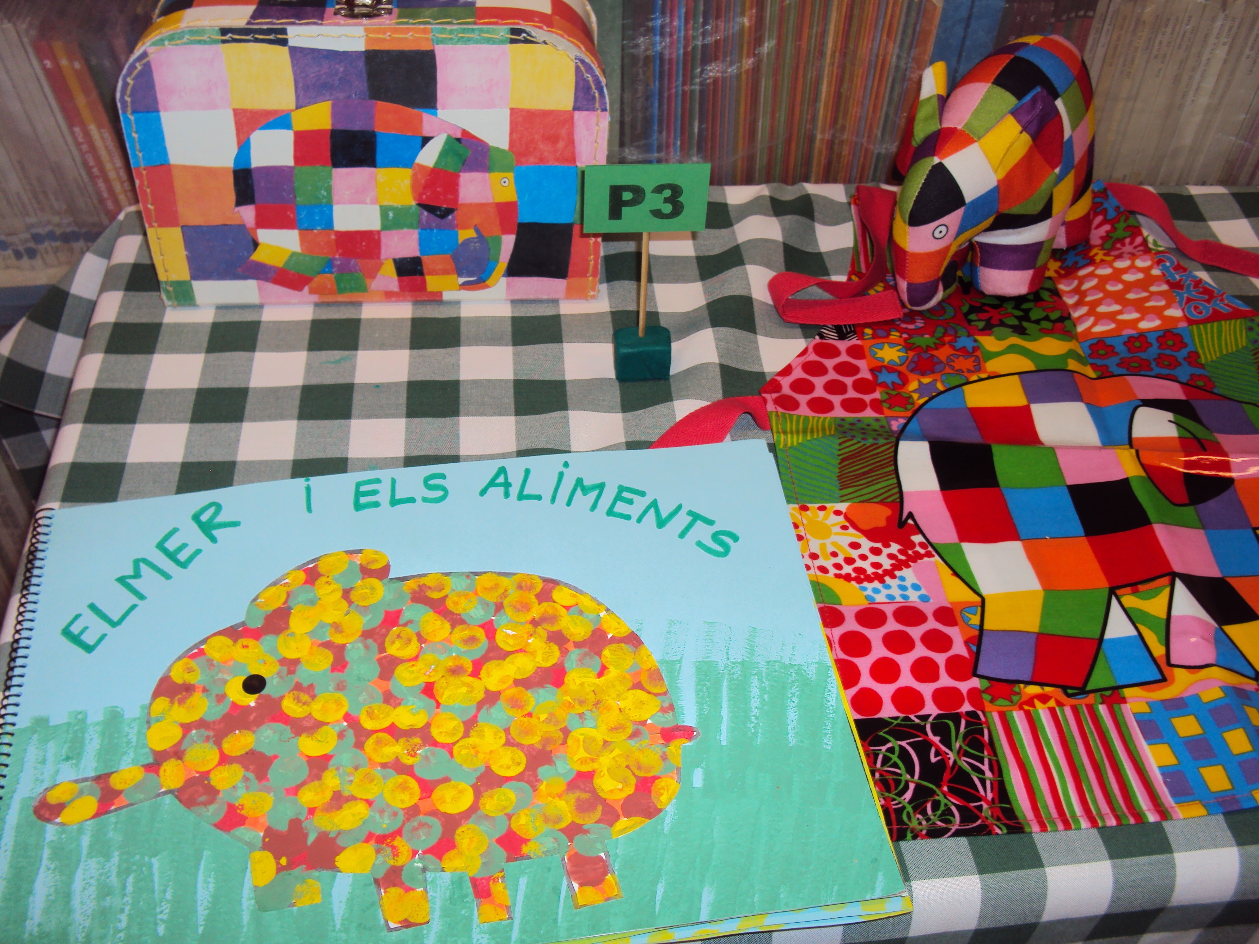 Els més petits, els de P3 han presentat un llibre col·lectiu que han anomenat “Elmer i els aliments”. Com que són la classe dels elefants i un gran dibuix de l’Elmer presideix la seva aula, van idear aquesta precuela de les aventures de l’Elmer, l’elefant de colors, un animal diferent, símbol de la diversitat i de les diferències que ens fan únics a cadascú de nosaltres. En David McKee mai ha explicat el perquè dels colors de la pell de l’elefant i aquest ha estat el motiu i l’excusa per idear aquest conte. L’Elmer, en néixer tenia la pell molt fina i sensible i com que només s’alimentava de la llet de la seva mare, la pell se li va tornar blanca. Després la seva mare el va anar habituant a menjar verdures, fruites i fulles dels arbres, tot de color verd. Aquest fet va suposar que la seva pell es tornes tota verda. Més tard, va tastar els aliments de color carbassa (pastanagues, taronges) i la seva pell es va tronar carbassa. I així successivament. Les il·lustracions de cada pàgina han estat treballades amb diverses tècniques (ceres, plastilina, collage, estampacions, etc).