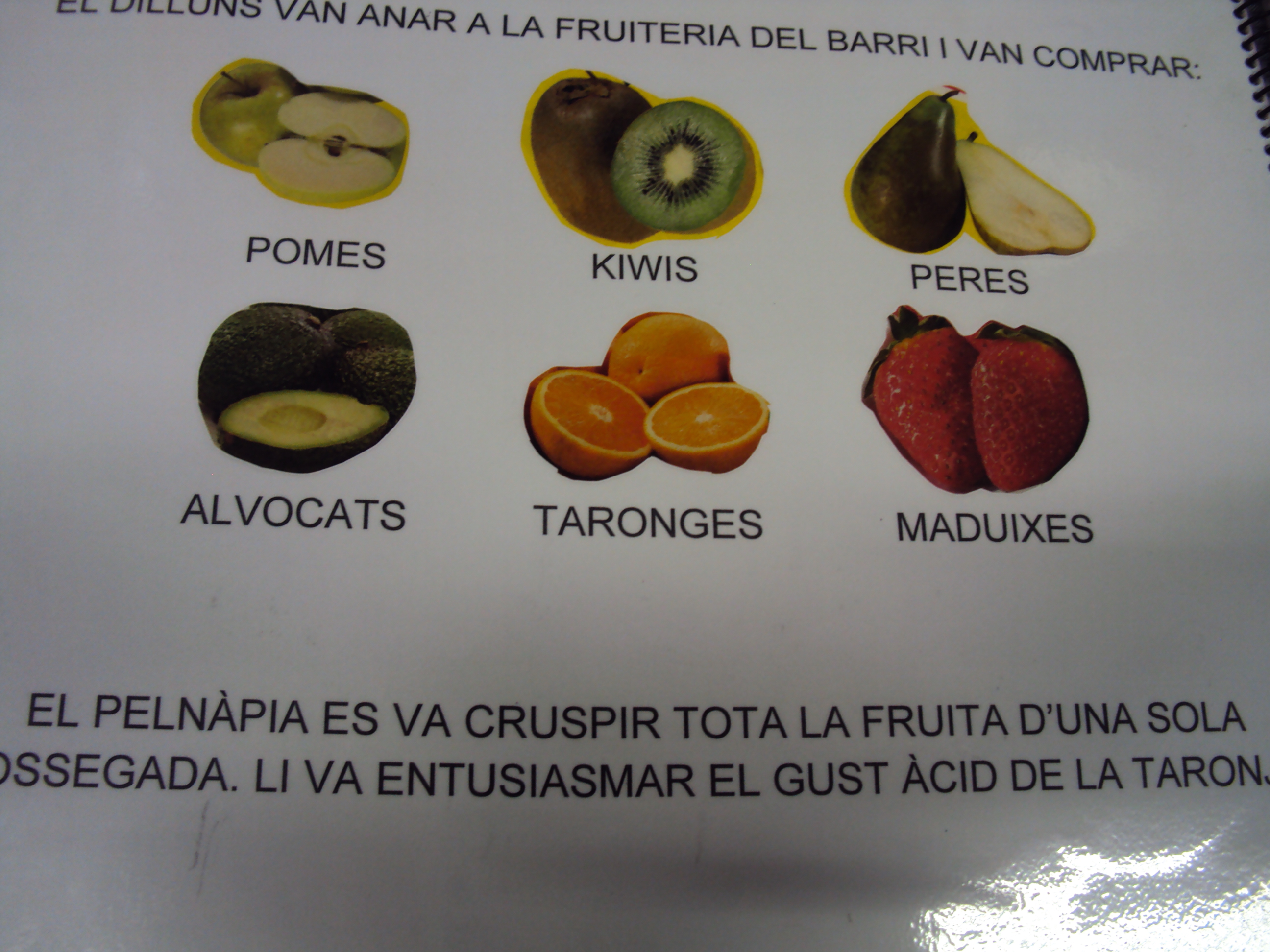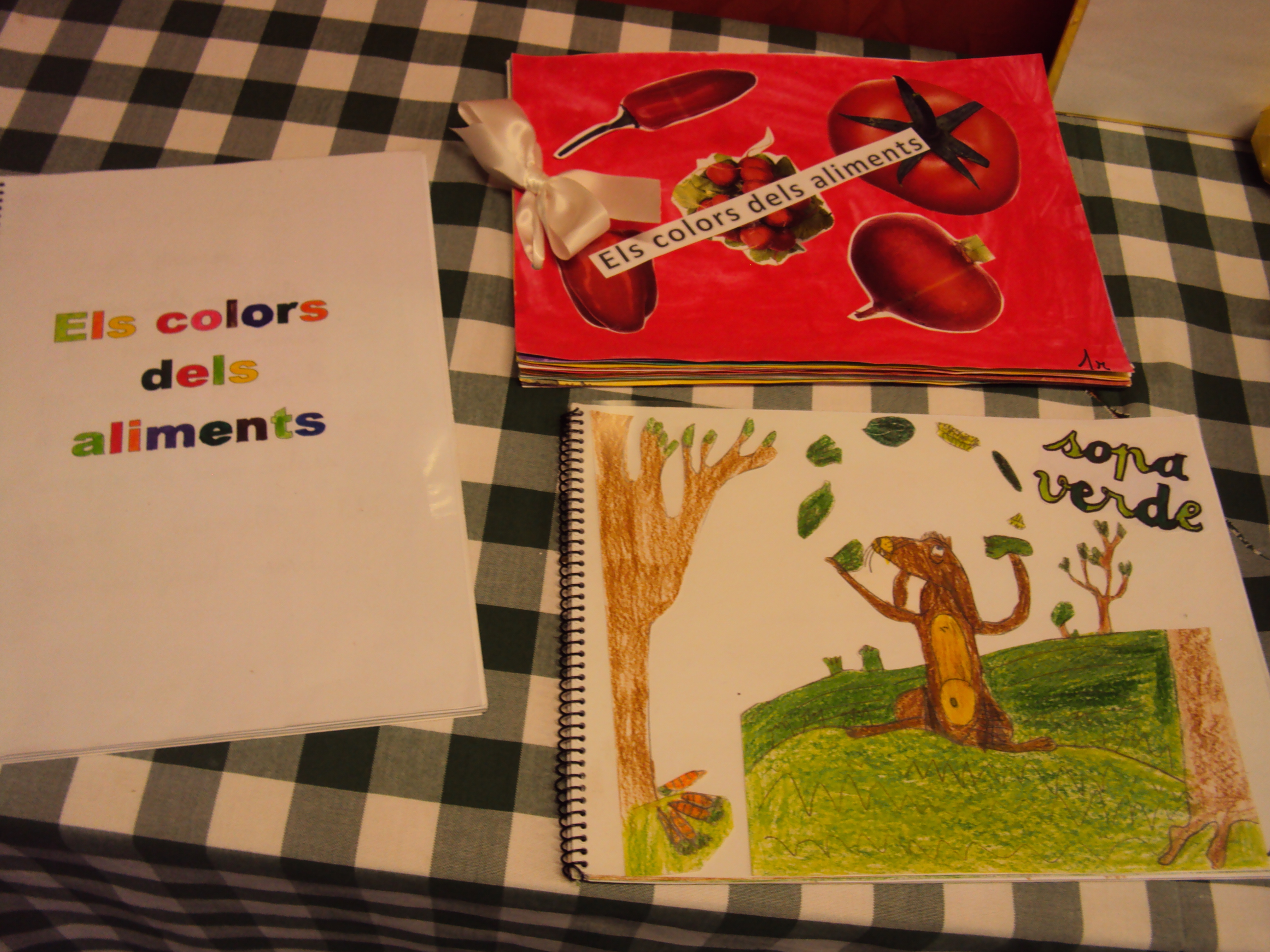 Els de primer de primària han abocat els seus esforços en relacionar els aliments amb els colors. Ho han fet basant-se en el llibre “La sopa verde”, un excel·lent àlbum il·lustrat, editat per OQO. Han presentat llistes d’aliments classificat per colors, imatges dels mateixos aliments i la rèplica del conte feta per ells.