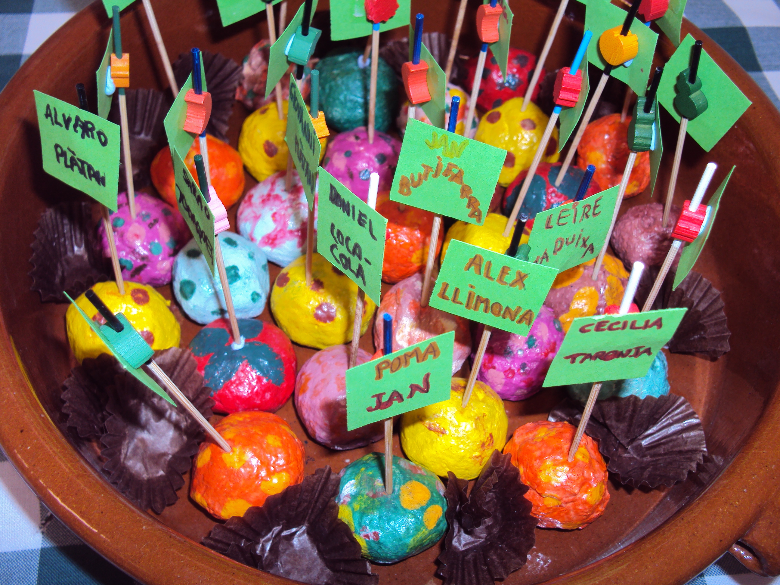 El grup de P5 han experimentat amb pintures fetes a partir de liquar diversos aliments (remolatxa, mandarina, julivert, etc.) amb els que han pogut pintar i estampar unes produccions plàstiques molt boniques. També han fet un petit llibret amb fotografies que recreen el poema “L’amanida” que van aprendre i recitar el dia de Sant Jordi. I ens han deixat un treball d’unes mandonguilles de fang molt originals.