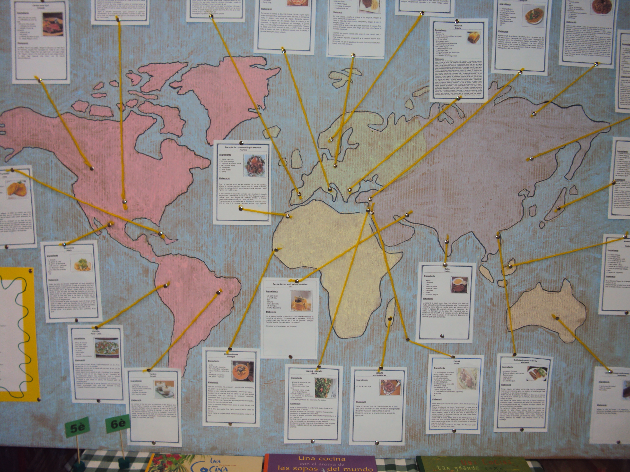 Els grups de cinquè i sisè van fer unes jornades gastronòmiques i unes investigacions dels aliments que s’elaboren a diverses parts del món. Acompanyen el llibre col•lectiu amb un gran mapa del món on es poden veure les diferències de costums segons els països.
