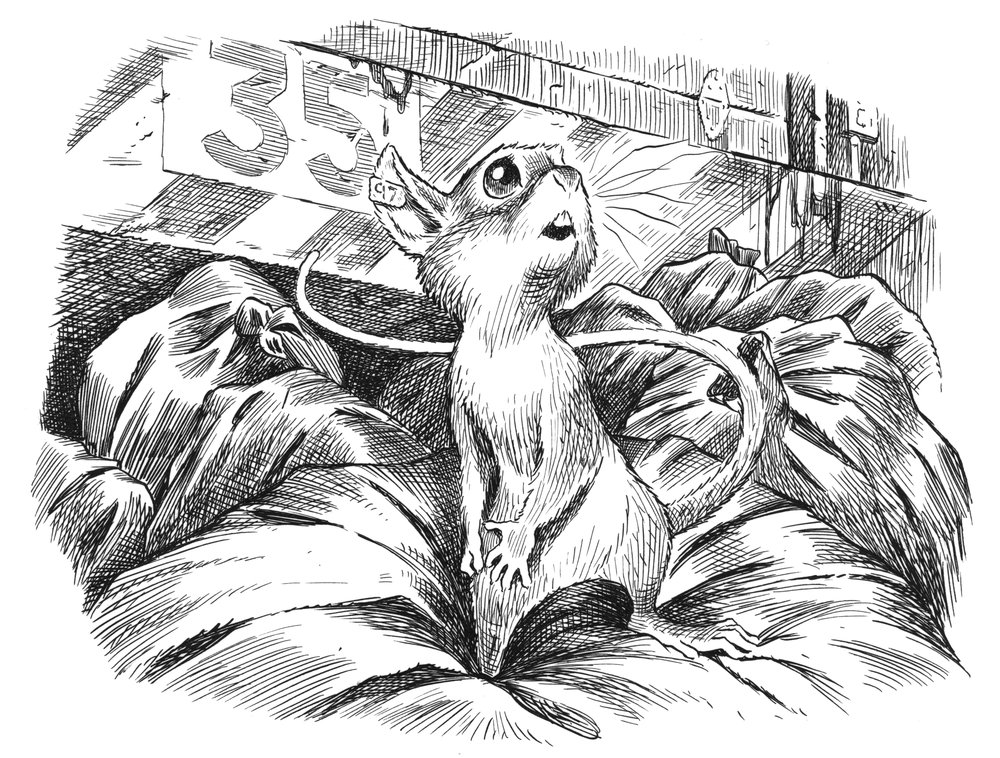 «Sé que la belleza de piel chocolate dejará de cantar en el momento en que vea mi alucinante color azul. Después de todo, es algo muy sorprendente. Así que, por el momento, me quedaré agazapado entre los arbustos, oleré mi diente de león y la oiré cantar para sí misma y para las abejas que zumban en los rosales. A las abejas les gusta zumbar carca de cualquier ratón que cante.