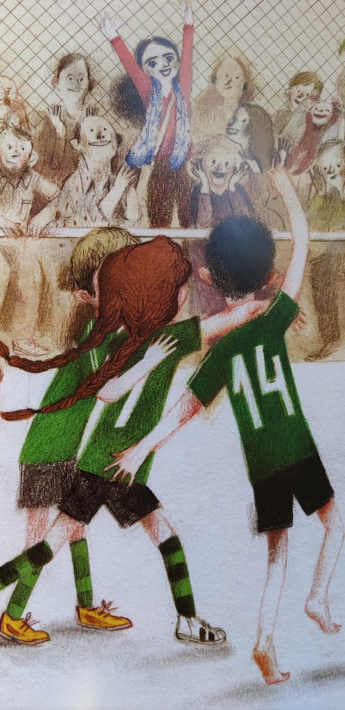 Explica la història d’un equip de nois que tenen un gran jugador, en Madani, que es molt estimat. El veieu a la coberta amb una capsa a la ma, envoltat dels seus companys com si estiguessin fent-se la foto protocol·lària de l’inici de partit. Tots somriuen i semblen feliços. Fixeu-vos amb els peus d’en Madani. Juga descalç perquè no té diners per comprar-se unes botes. Aquesta és la clau del relat.