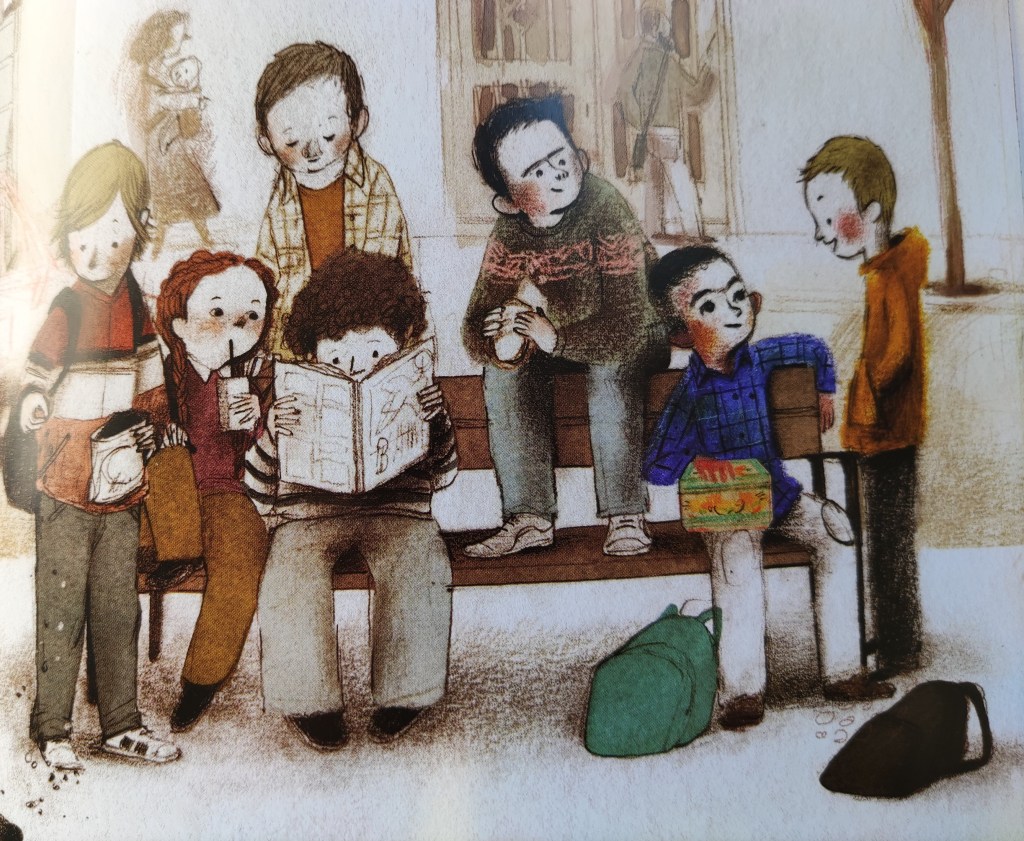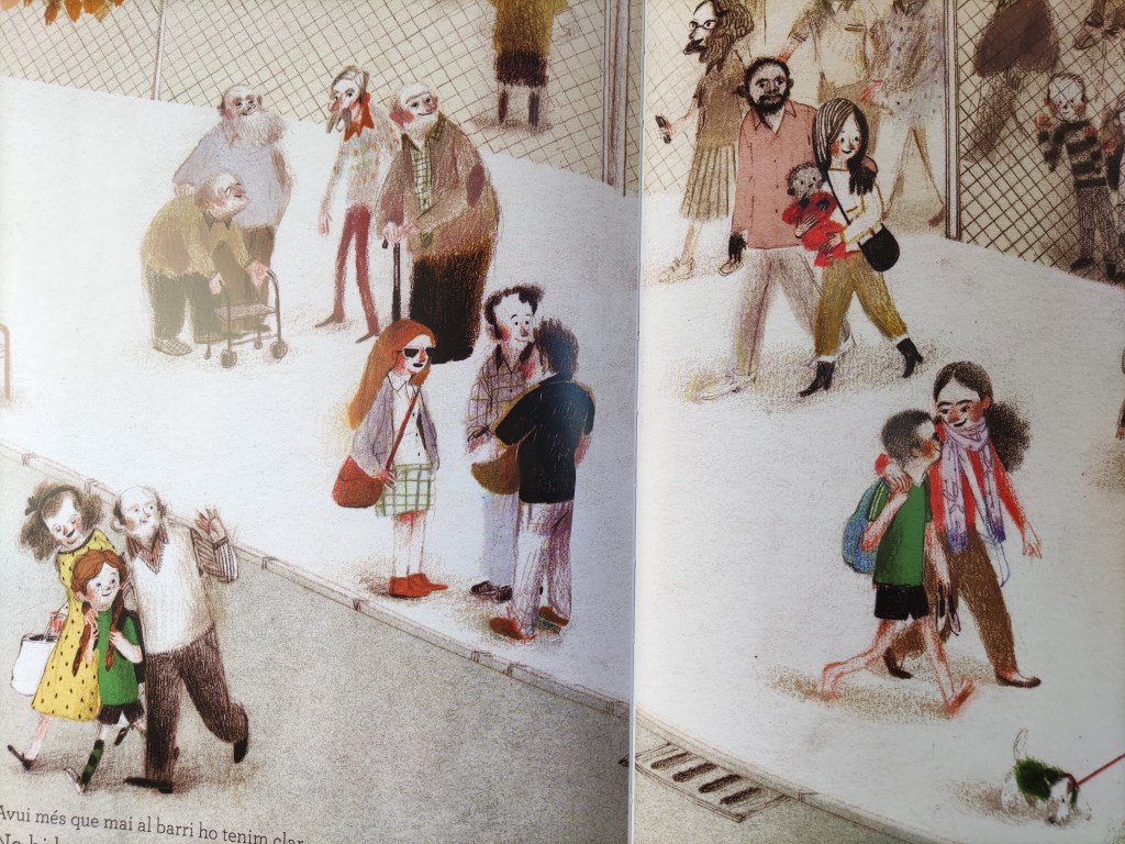 La il·lustradora, la Raquel Catalina, ha sabut trobar el punt perfecte per fer un relat atemporal, amb unes il·lustracions que plasmen la vida d’un barri humil, amb personatges entranyables. Empra el gouache i els llapis de colors.