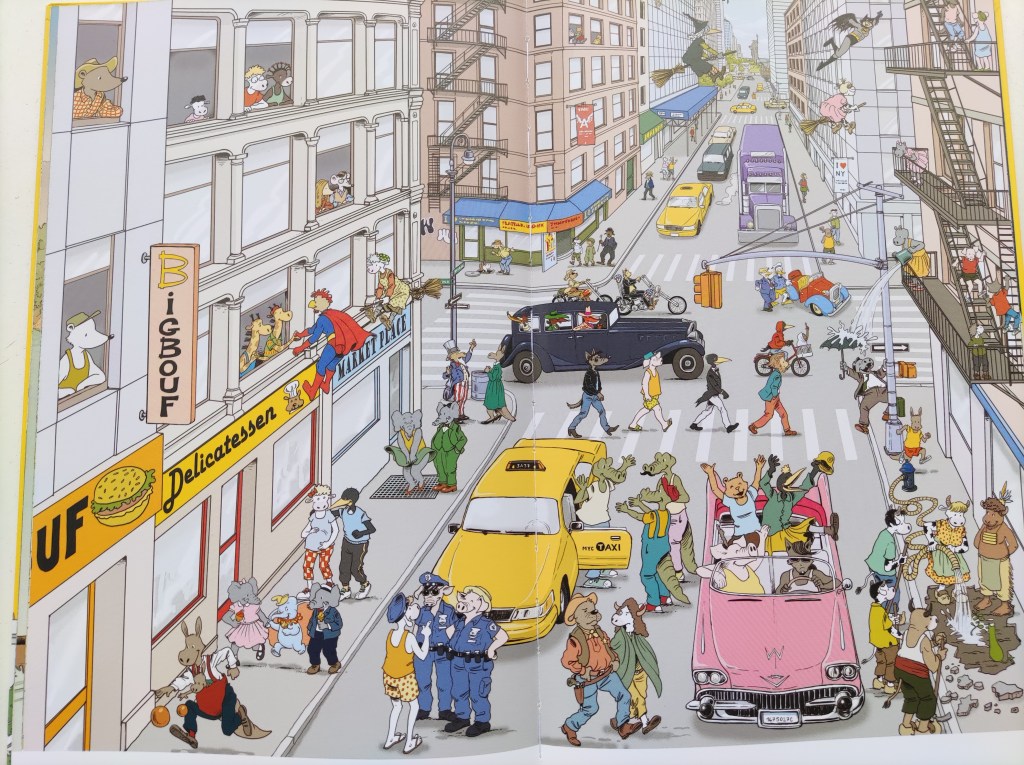 …potser sereu capaços de trobar superherois cinematogràfics (Superman, Batman), l’hipopòtam fent de Gene Kelly (Singing in the rain), personatges de cinema (Charlot, Dumbo, King Kong, ET); també podreu localitzar a l’ànec Donald al costat d’un altre Donald (Trump) i intuir referències a Marilyn Monroe, Easy rider, l’Oncle Sam, les hamburgueses, en Woody Allen, James Dean, etc. Mil i una possibilitats de conversa que també trobareu a les altres pàgines.
