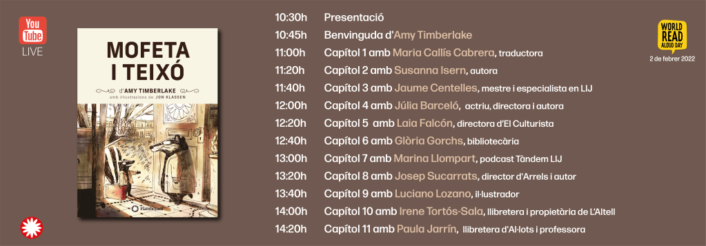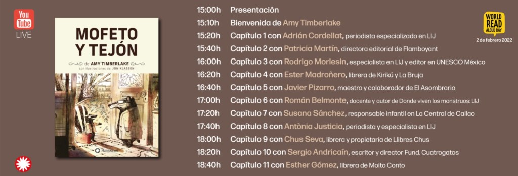 Enguany, Flamboyant s’ha tornat a sumar a la iniciativa. Durant aquell dia, llegirem en veu alta Mofeta i Teixó, escrita per Amy Timberlake i il·lustrada per Jon Klassen. Pel matí en català, a partir de les 10:30 hores. Cadascú dels convidats llegirem un capítol. Crec que serà força divertit i emotiu.