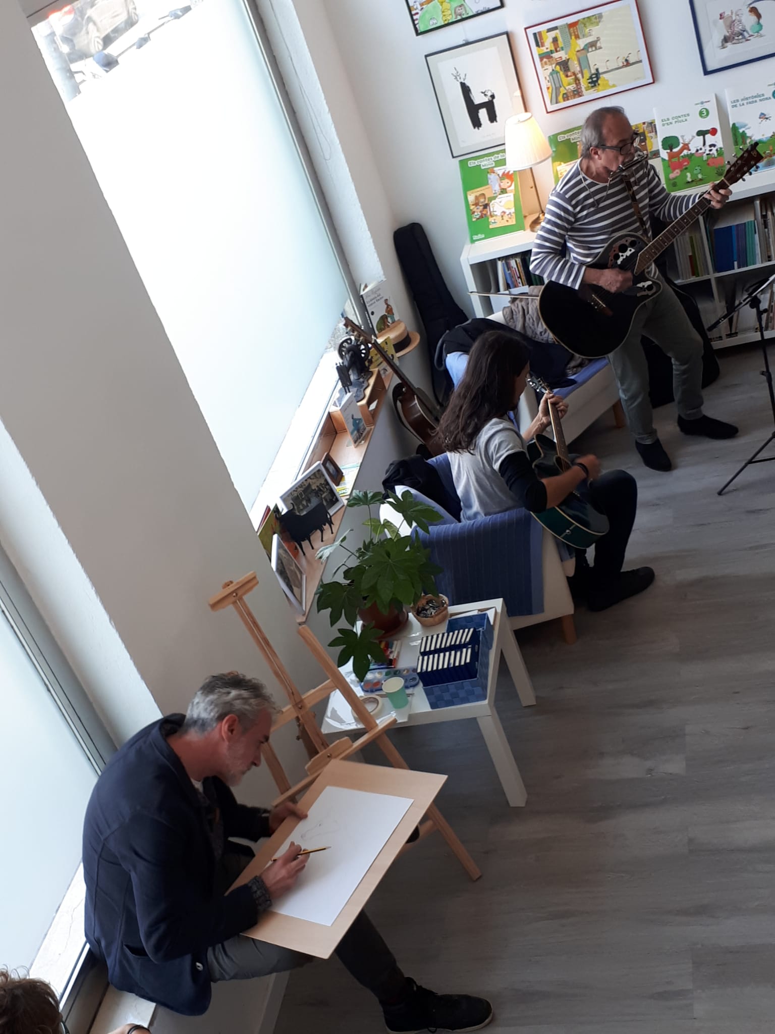 Va començar la trobada explicant com es va iniciar en la lectura. Resulta curiós que, igual que molts dels autors que conec, expliqués històries relacionades amb els tebeos. En el seu cas, a la seva infantesa, en un poblet a prop de Dijon, va recordar com anava a una mena de lloc on s’abocaven deixalles i allà recollia tebeos que l’apassionaven i dels que encara conserva una bona pila. També ens va comentar que era una època que les parets de casa seva estaven cobertes de paper pintat i el de la seva habitació tenia dibuixos d’esquirols, de boscos i animals diversos, i potser per això té aquesta tendència de fer animals en els seus contes.