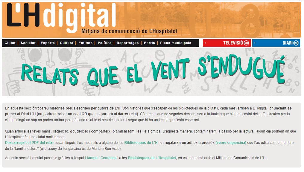 Abans d’ahir, 19 de setembre, vam iniciar una acció amb la col·laboració del Servei de Biblioteques de l’Hospitalet i el Diari de l’Hospitalet. Cada mes, donarem a conèixer un relat breu d’un autor o autora de la ciutat que es podrà llegir en digital a lhdigital i també en format paper a les revistes que es bustien a totes les cases de la ciutat.