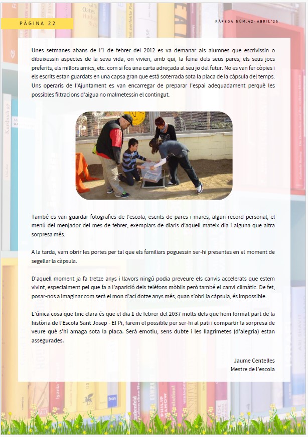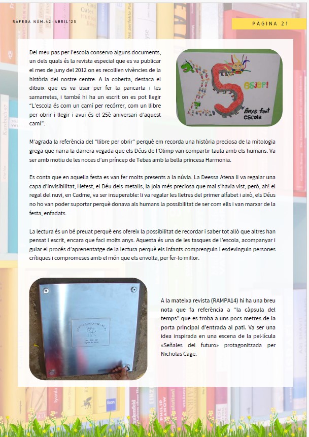 Al final de cada trimestre, s’edita RÀFEGA, que és una publicació digital de l’AFA en la que cada classe de l’escola fa un article, des d’I3 fins a 6è. Es destaquen, a manera de resum o memòria de les activitats més rellevants que s’han portat a terme en aquell trimestre. Em va demanar que expliqués el significat d’una placa que es troba incrustada misteriosament al terra, en un cantó del patí. I ho vaig fer, encantat de la vida, esclar!