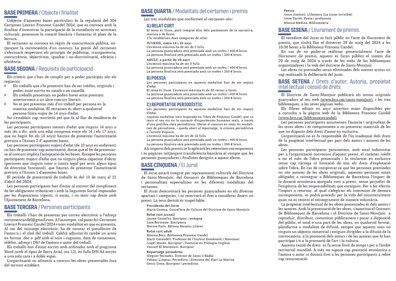 Trenta es diu de seguida, però són un bon grapat d’anys que des del Districte de Sants-Montjuïc es fa una aposta per la escriptura i la literatura. En aquests anys hi ha hagut alguna categoria que s’ha afegit i altre que han anat variant el seu enfocament, sempre amb la intenció de fer-ho més participatiu i de major qualitat.