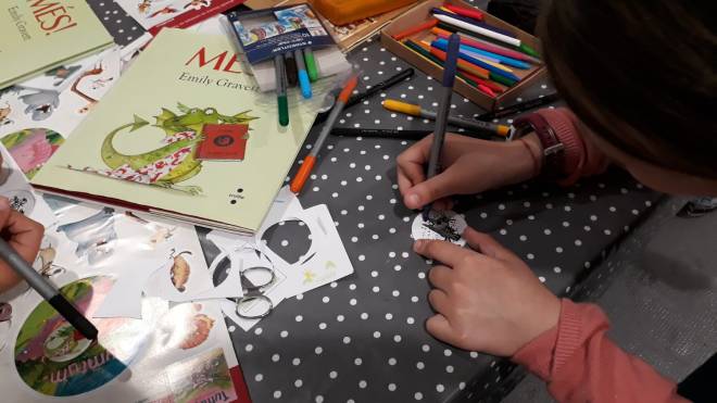 La sessió la vam començar mirant i comentant alguns dels llibres de l’Emily i vam explicar la facilitat que té per dibuixar animals domèstics.