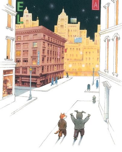 «La guineu és una de les poques criatures salvatges del món que pot sobreviure amb èxit a la ciutat» és la primera frase d’aquest àlbum. Imagino que és veritat perquè les guineus són prou llestes per adaptar-se a qualsevol ecosistema. A més, a la rondallística popular, normalment formen part del cicle d’«el llop i la guineu» on representen la saviesa i l’astúcia i els llops la força i la beneiteria.