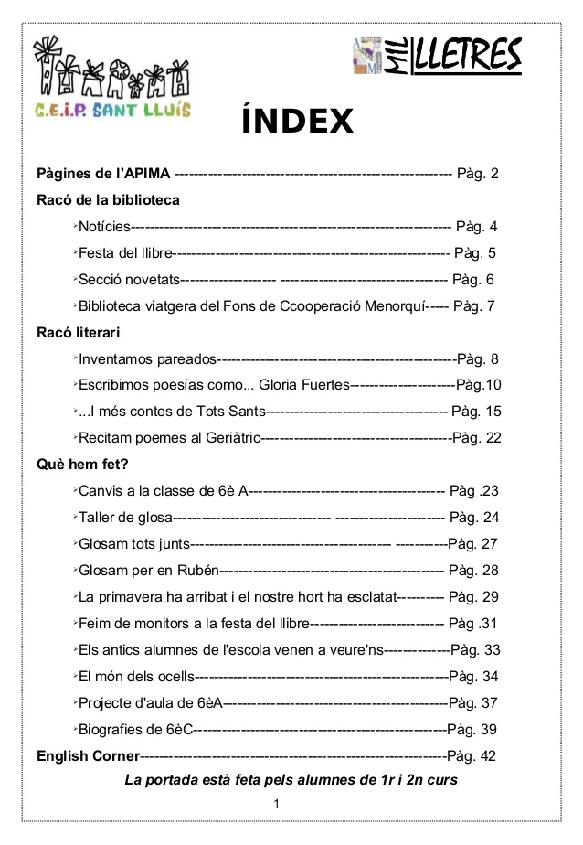 Moltes escoles fan revistes i les publiquen al seu web. És una bona manera de compartir i així veiem el que fan, de vegades lluny de nosaltres. Aquest dies m’ha arribat la «Mil Lletres» que fan a l’escola de Sant Lluís (Menorca) i m’ha agradat molt comprovar amb quina passió viuen el fet lector, les activitats que emanen directament de la biblioteca i la implicació de bona part de la comunitat escolar. No puc fer altra cosa que compartir-la per si us ve de gust fer-li una ullada perquè potser trobareu alguna idea per adaptar-la a la vostra realitat.