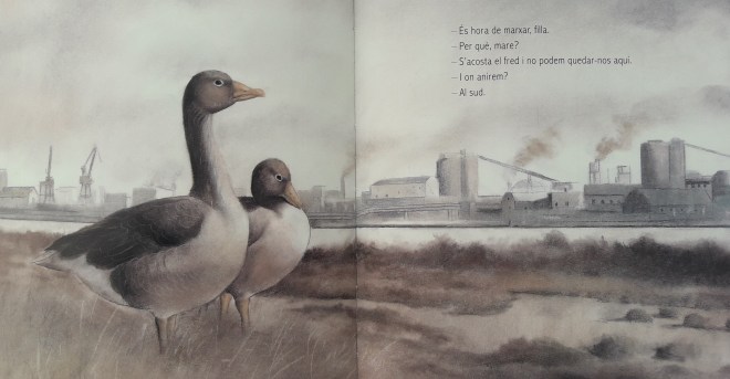 Comença amb dues planes que marquen el que anirem veient. A la primera es veuen dues ànegues que miren cap a la dreta, cap a l’horitzó, cap al futur, i mantenen el diàleg següent: