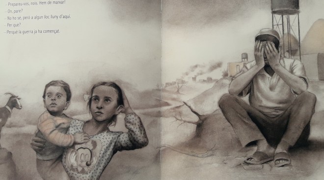 A la plana següent veiem, amb la mateixa paleta cromàtica, mirant cap a l’esquerra, una família, un pare i dos fills, amb expressió abatuda que també conversen: —Prepareu-vos, nois. Hem de marxar! —On, pare? —No ho sé, però a algun lloc lluny d’aquí. —Per què? —Perquè la guerra ja ha començat!